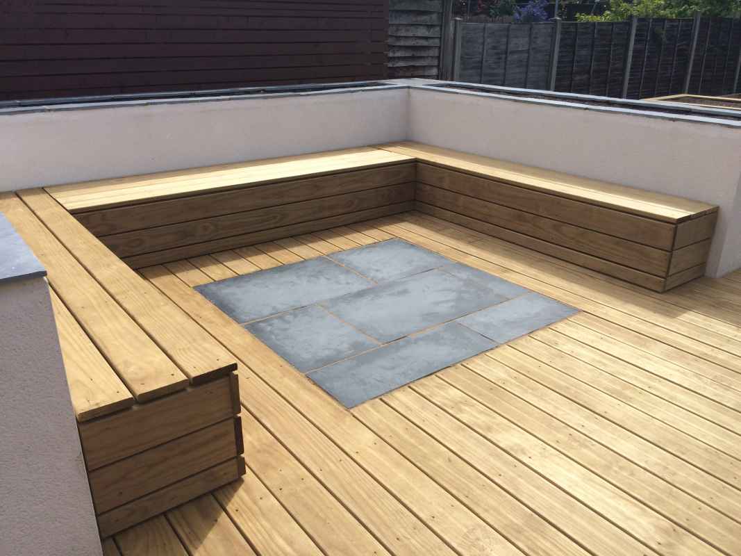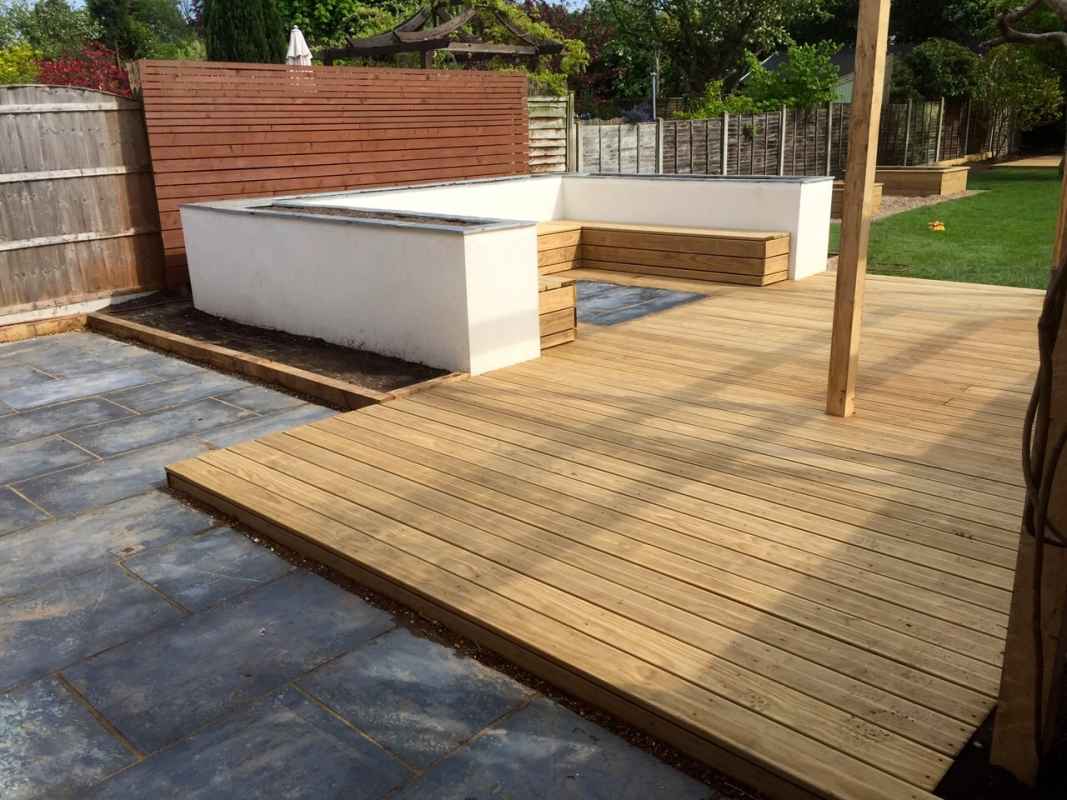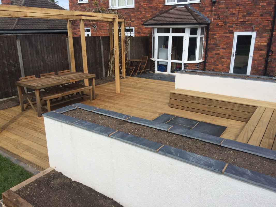 We started towards the house with the main seating area comprised of a built in seating area, kiln dry decking and a slate patio. The real defining feature of this area was the oak pergola that a beautifully established wisteria will eventually drape over.